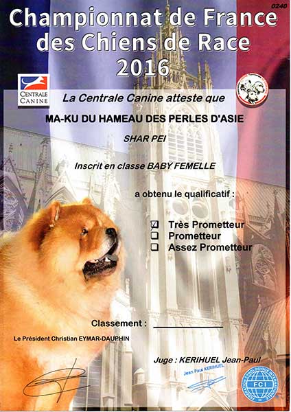 Ming-Jiang du Hameau des Perles d'Asie ainsi que sa sœur Ma-Ku du Hameau des Perles d'Asie ont participé au Championnat de France 2016 qui s'est déroulé à Metz le 04 juin 2016. Les deux ont été classés très prometteurs.